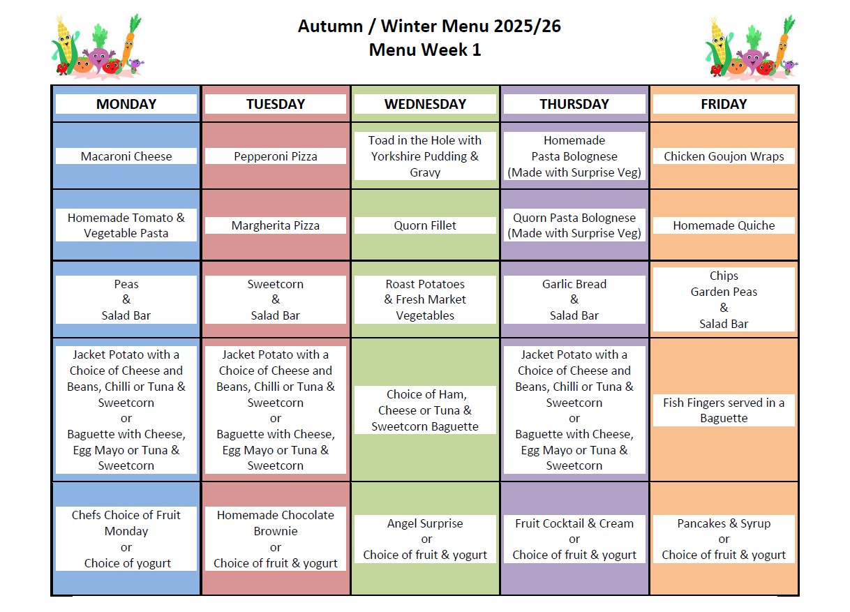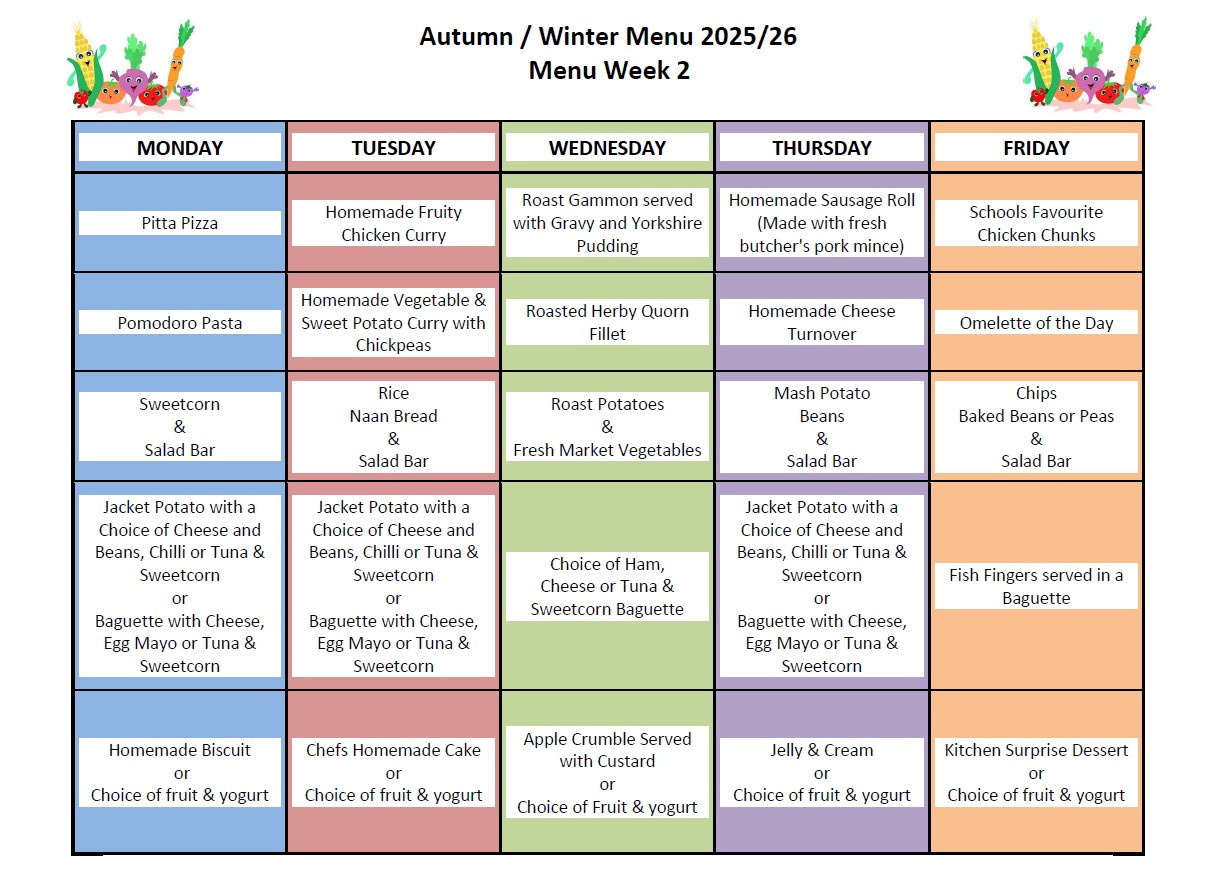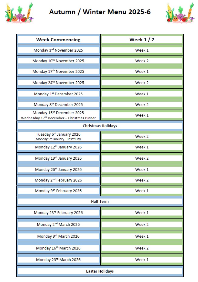 The below menus will commence from 3rd November 2025. They are on a 2 weekly rotation, please see below for details of weeks and dates.